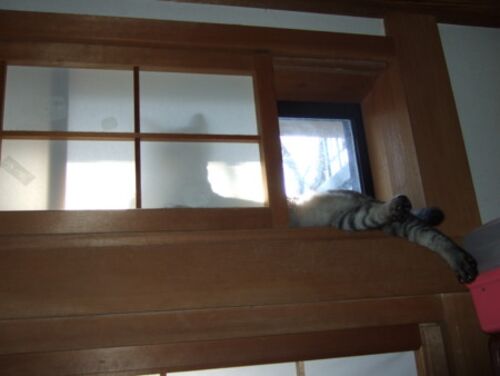 この時期、猫は暖かいところを求めて大体決まった場所にいる。 鈴も京もコタツにいることが多いのだが、今日の昼間コタツを覗いたら、2匹のうち京しかいない。 鈴を探すと欄間障子に寝ていた。 鈴はカメラの音を好まないので、目を覚ましてしまったが、その…