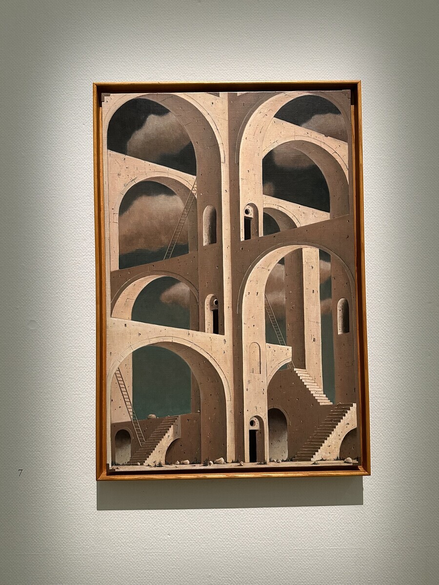 ピラネージ、チャールズ・ シーラー、エッシャー、キリコ、ブリューゲルなど様々な架空建築の過去の作品を連想させつつも色彩とモチーフで独自の世界を見せてくれる。